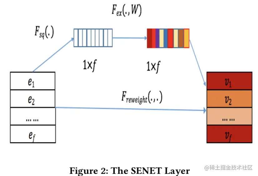 SENET层学习每个特征的权重对Embedding进行加权,分为以下3步