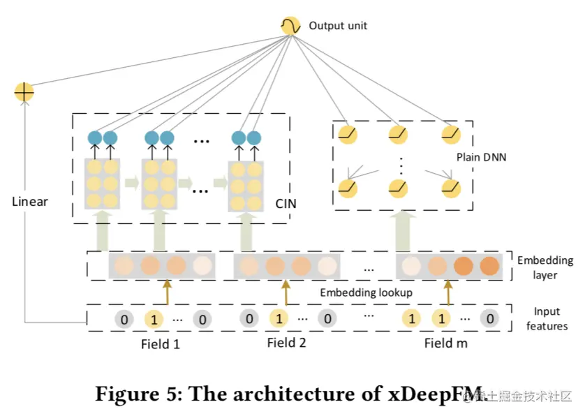 看xDeepFM的名字和DeepFM相似都拥有Deep和Linear的部分,只不过把DeepFM中用来学习二阶特征交互的FM部分替换成了CIN(Compressed Interactino Network)。而CIN是在Deep&Cross的DCN上进一步改良的得到。整体模型结构如下
