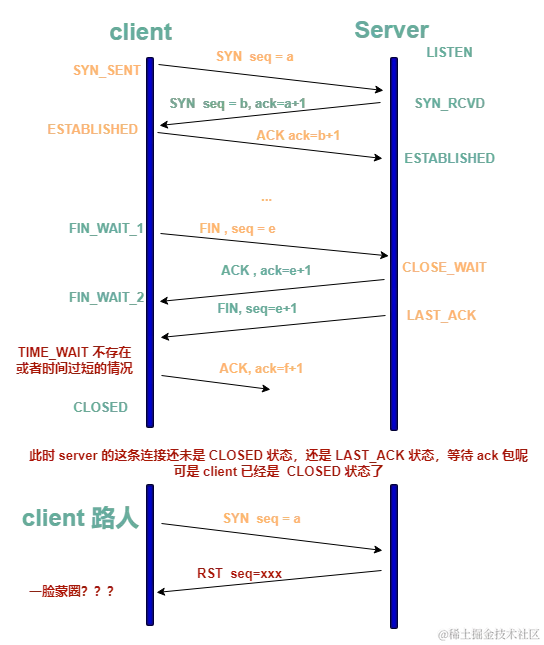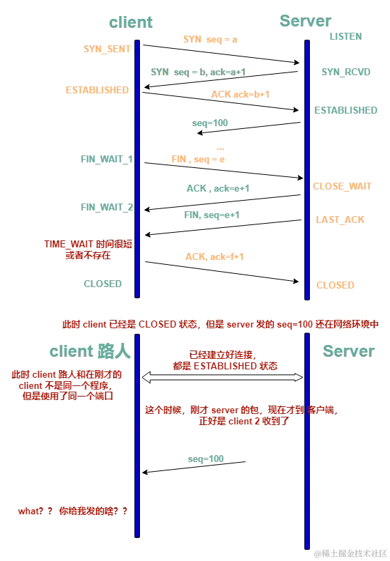 - 这个时候,和 client 占用同一端口的程序 client 路人启动程序并和 server 成功建立连接之后,刚才的 seq=100 的包才到目的地址,这个时候 client 路人并不期望收到这个 seq=100 的消息,那么这对 client 路人来说,这就是一个异常问题了
