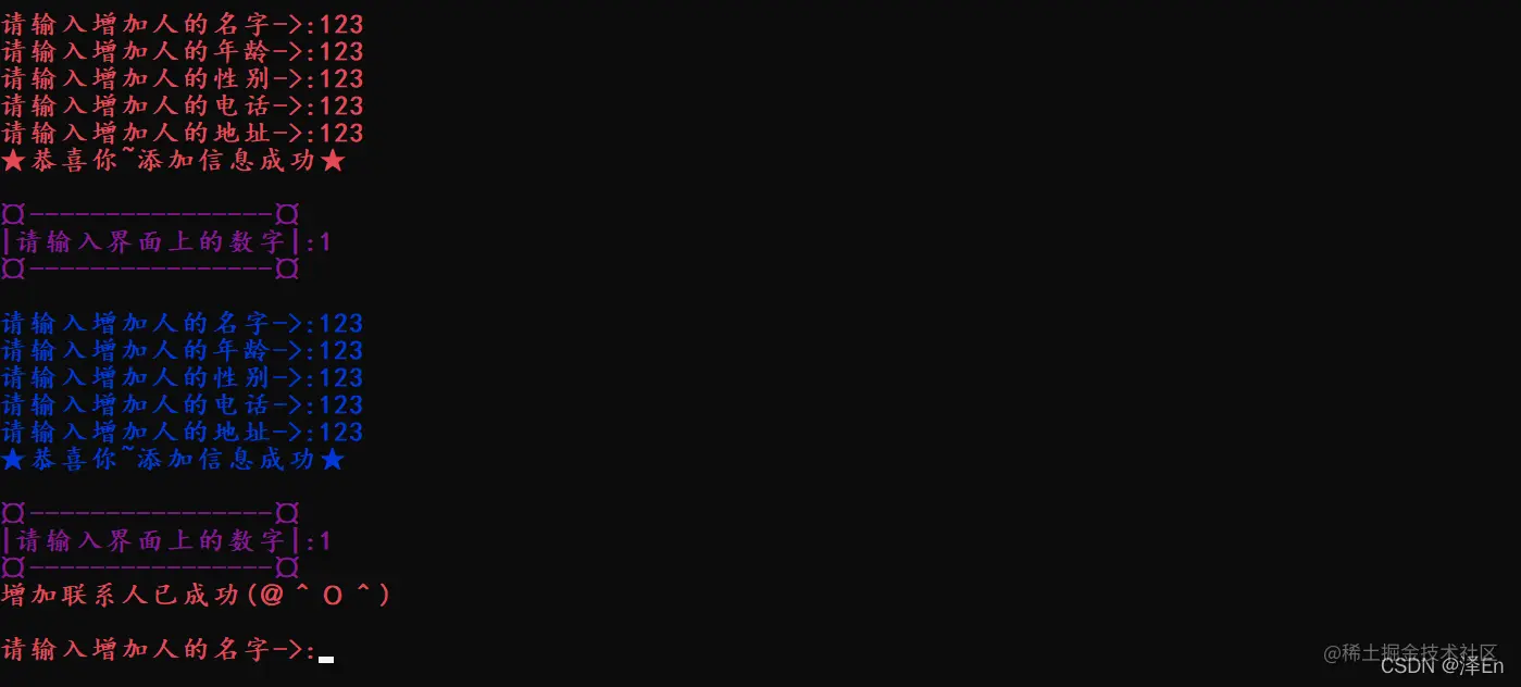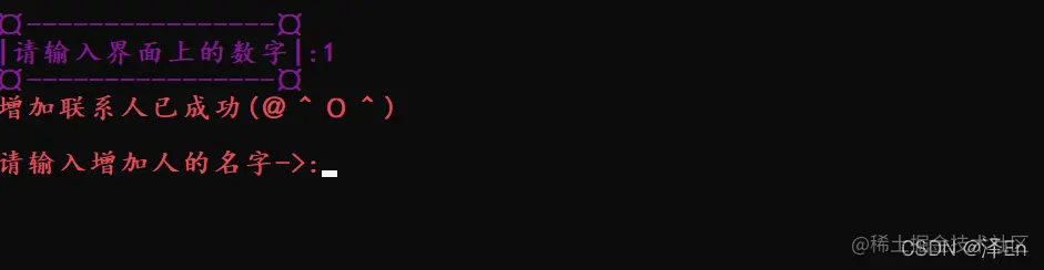 此时,再输入就会显示增加联系人成功,因为我们每次增量加2的。内存空间已满又要向堆区申请内存空间。