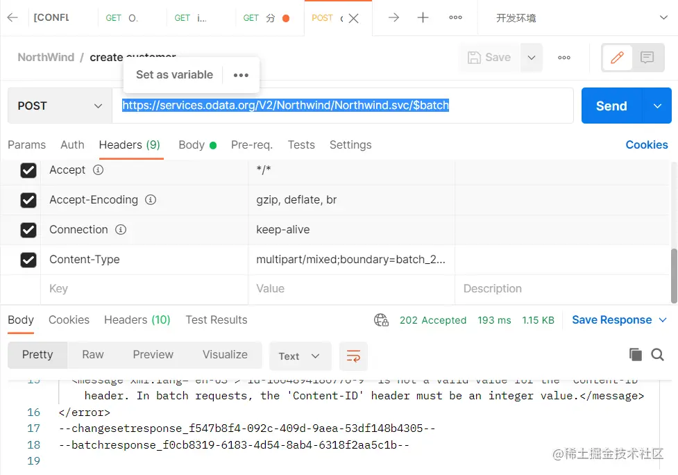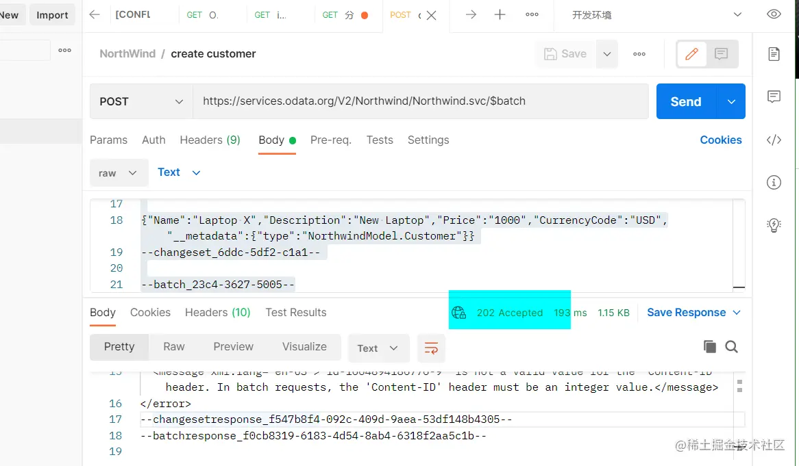 使用 Postman 给 Northwind 发送 HTTP post 请求创建 customers 的 script: