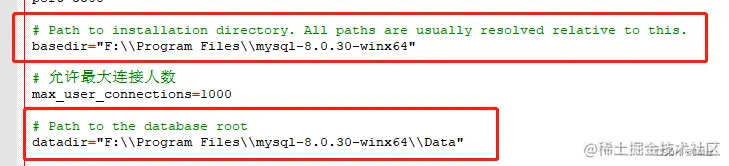 和datadir=?这两个文件的存储位置了,另外,如果MySQL的文件夹也发生位置变化,比如加装了移动硬盘,重新分区;环境变量也需要跟着修改配置。