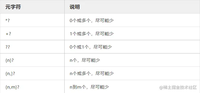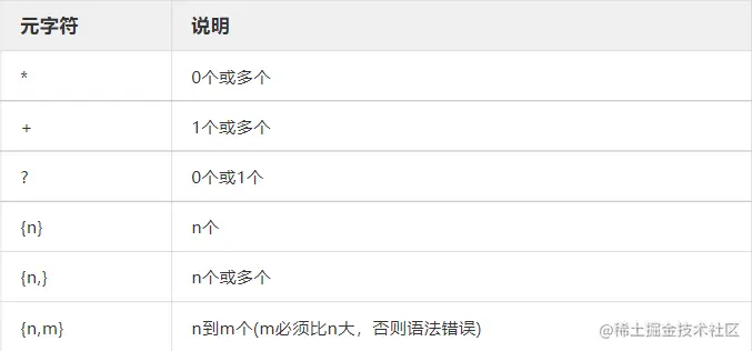 有些元字符用于表示某种元素的数量,如\d表示一个数字,当你想表示6位数字怎么办?当然可以\d\d\d\d\d\d ,但确实太麻烦了,为了简便就需要一些表示数量的元字符,上述可以写成\d{6},元字符详情如下:\