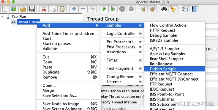 重启 Jmeter 后再采样器可,以看到 Dubbo Sample 的存在。