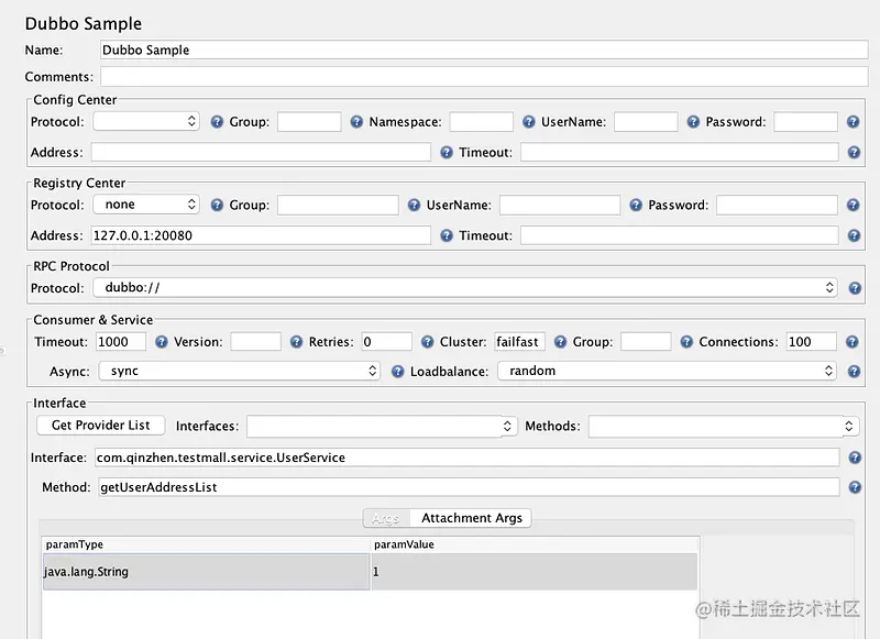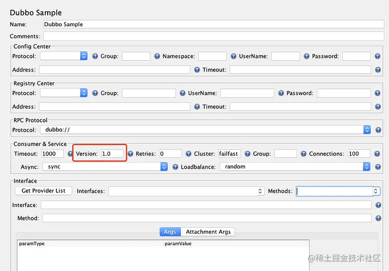 打开Dubbo Sample后我们会看到如上图的配置(可能根据版本的不同会有所变化),如果遇到了相同的情况,将Version中的"1.0"删除,否则会影响我们的传参,然后再填入接口的信息即可,如下:
