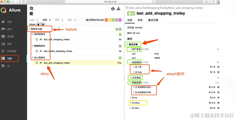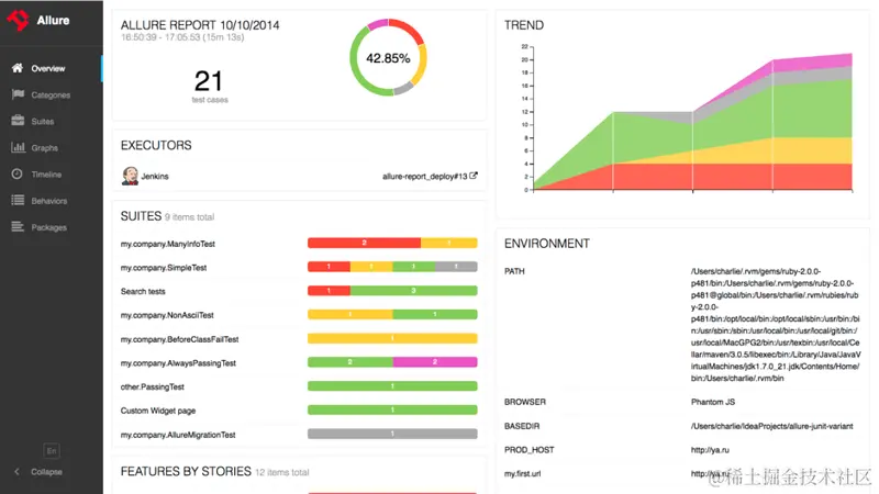 上面的测试报告首页中展示了此次测试的测试用例数量以及成功用例、失败用例、跳过用例的比例、测试环境、SUITES、FEATURES BY STORIES 等基本信息。当与 Jenkins 做了持续置成后,TREND 区域还将显示,历次测试的通过情况。
