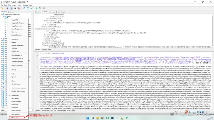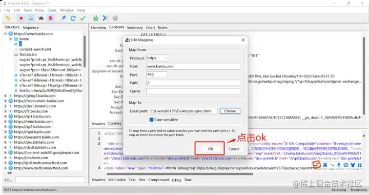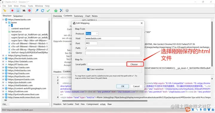 3.设置 Charles 进行 map local,右键点击 Map Local->进入 Edit Mapping ->点击 choose ->选择修改后的 html->点击 OK