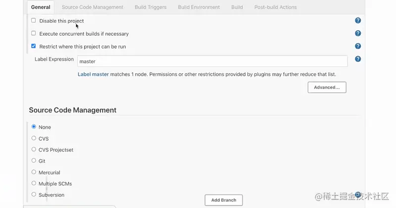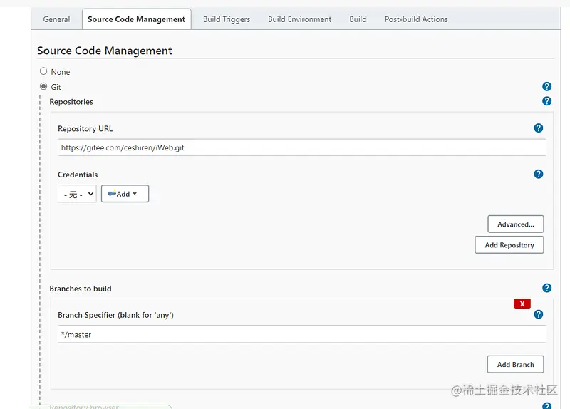 - 配置代码源,将被测项目代码的 git 地址配置到此处。