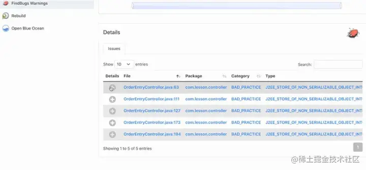 - 点击每一条问题信息左边的加号都能进入到具体哪行代码报出了问题,出问题的具体信息,就能根据提示的信息去分析可能的出错,与开发人员进行沟通解决;多次构建操作后就能看到趋势图的展示。