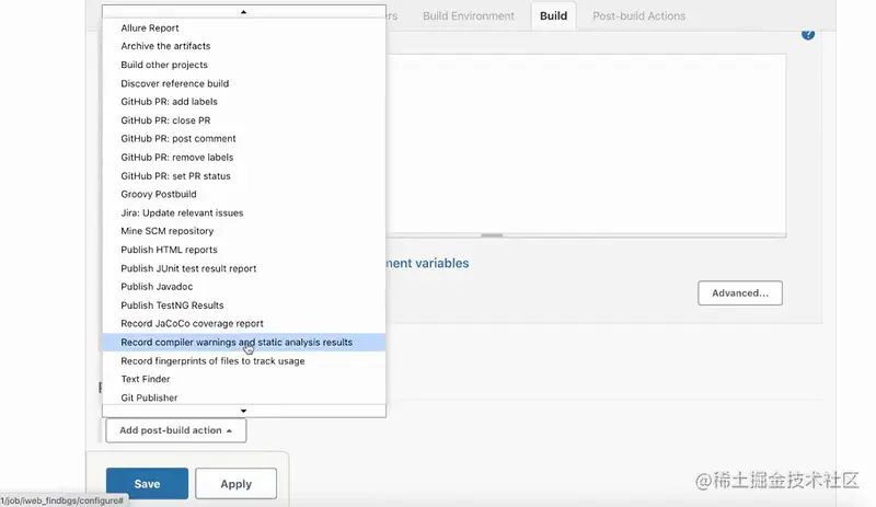 - 在构建后步骤(Post-build Actions),选择 Record compiler warnings and static analysis results。