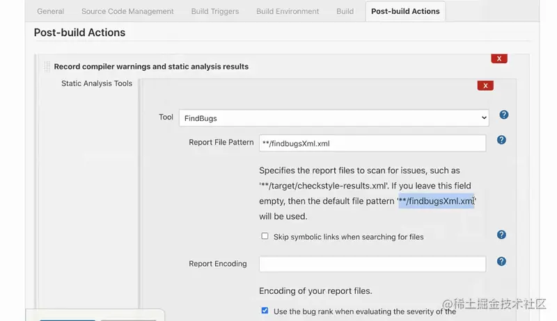 - 在静态工具中选择 FindBugs 在 Report File Pattern 配置上