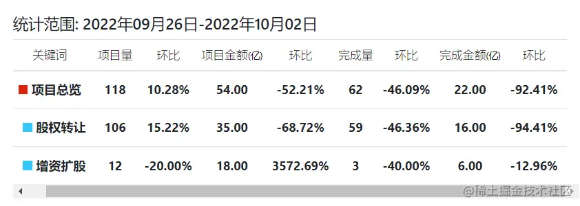 主要对项目总览、股权转让、增资扩股进行汇总,从项目量、项目金额、完成量、完成金额等维度出发,并做了环比计算。详情如下图: