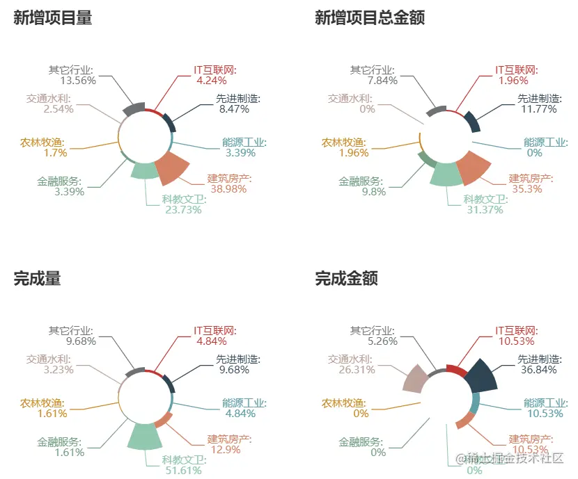 塔米周报按照行业对新增项目量、新增项目总金额、完成项目量、完成项目金额进行了统计并可视化展示。