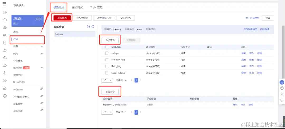 注册设备后,我们可以在华为IoT平台产品中的模型定义里创建一个产品,并添加服务、属性、命令等内容。