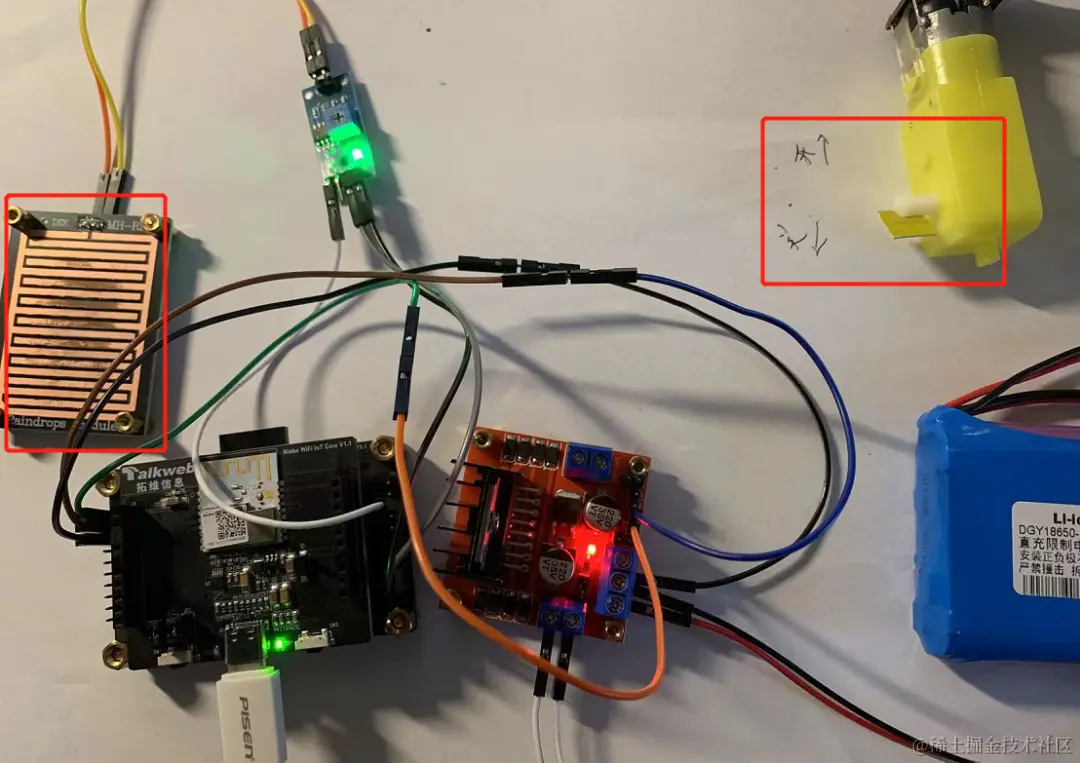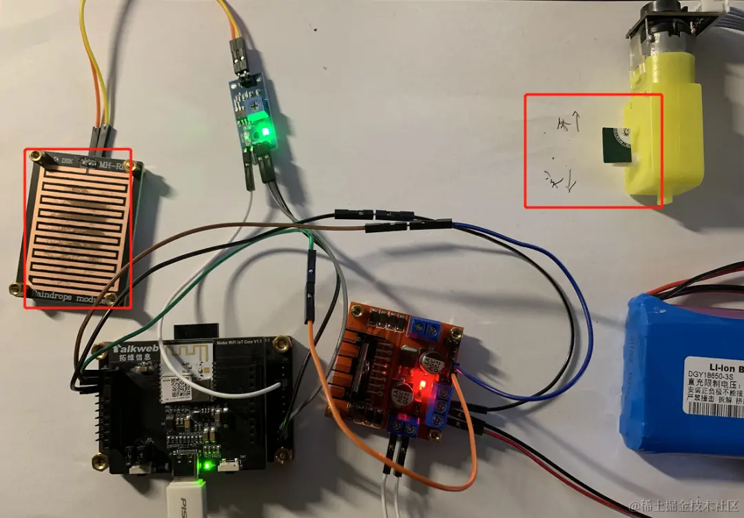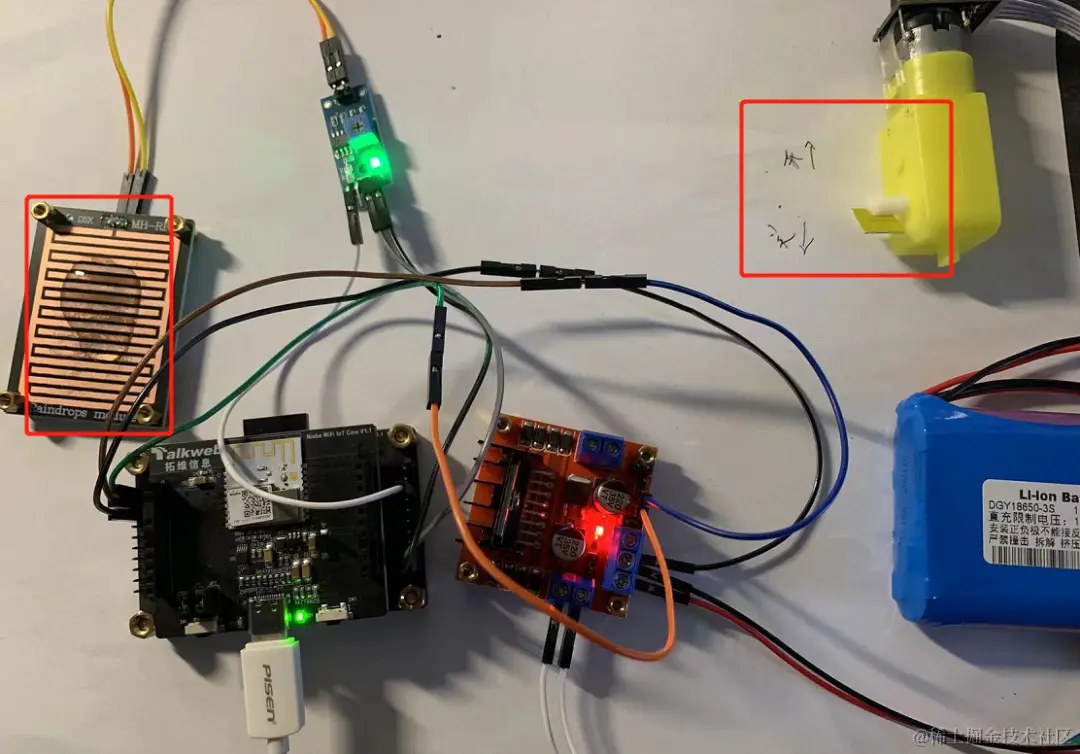 可在雨滴传感器上滴上水珠,达到预定的阈值时,电机转动模拟关窗。