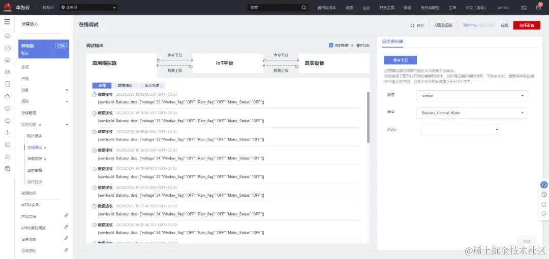 华为IoT平台在线调试--可看到数据接收和命令发送的情况: