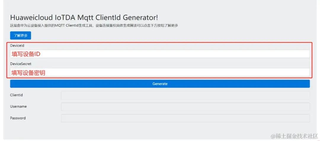 ④ 进去设备对接信息网站填写设备ID、设备密钥:IoT-tool.obs-website.cn-north-4.myhuaweicloud.com/