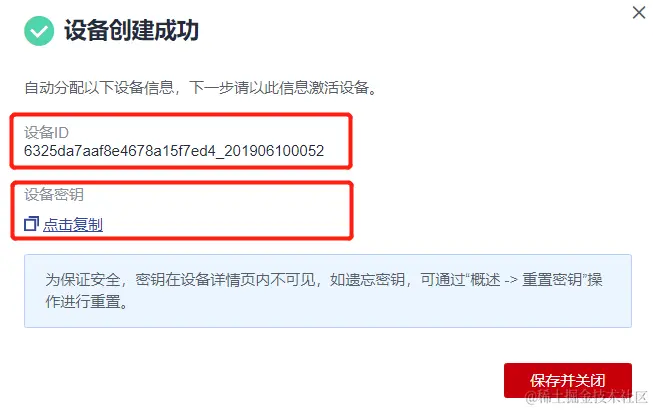 ③ 点击确认后会有两条设备信息,一条为设备ID另外一条为设备密钥,点击保存并关闭会提示你下载一个txt文件,txt文件里面就包含这两条信息。