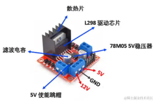 (3)该模块可以直接驱动两路3-30V直流电机,并提供5V输出接口,可以方便地控制直流电机速度和方向