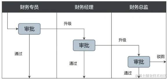 我们可以发现审批人的业务之间有环环相扣的关联,对于超出审批人职权范围的申请会传递给上级,直到解决问题为止。这种传递机制就需要我们搭建一个链式结构的工作流,这也是责任链模式的精髓之所在。