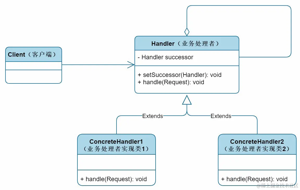 Handler(业务处理者):所有业务处理节点的顶层抽象,定义了抽象业务处理方法handle()并留给子类实现,其实体方法setSuccessor()(注入继任者)则用于责任链的构建。对应本章例程中的审批人Approver。