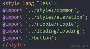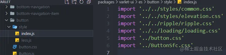 样式部分Varlet使用的是less语言,样式比较少的话会直接内联写到Vue单文件的style块中,否则会单独创建一个样式文件,比如图中的button.less,每个组件除了引入自己本身的样式外,还会引入一些基本样式、其他组件的样式: