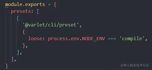 主要就是配置了一个presets,presets即babel的预设,作用是方便使用一些共享配置,可以简单了解为包含了一组插件,babel的转换是通过各种插件进行的,所以使用预设可以免去自己配置插件,可以使用本地的预设,也可以使用发布在npm 包里的预设,预设可以传递参数,比如上图,使用的是@varlet/cli包里附带的一个预设: