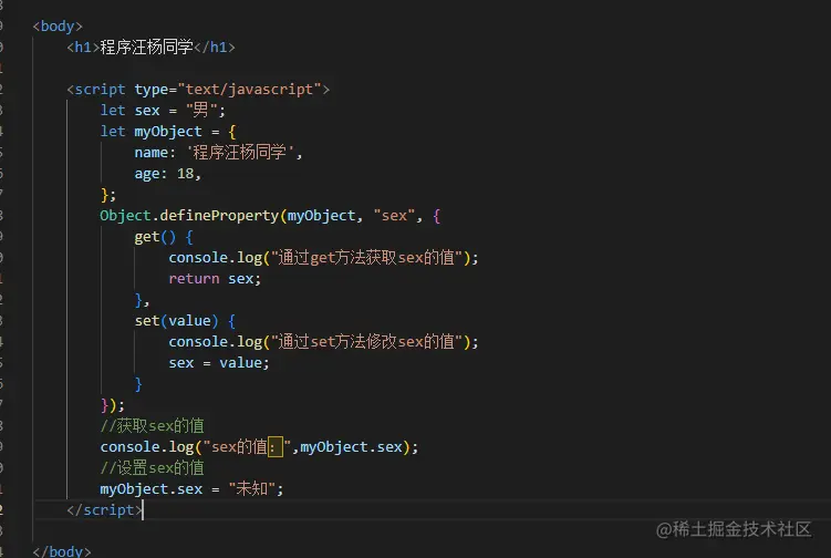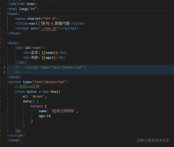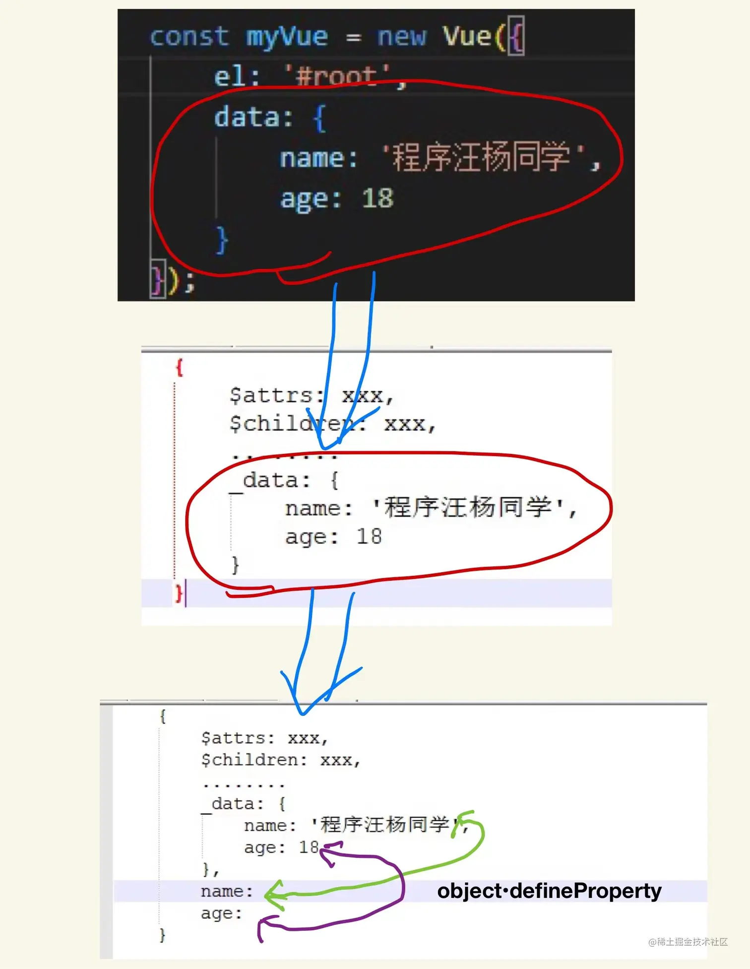 通过上图,我们发现: 通过 mymyVue.name去获取vue里data的属性值; 通过Vue.name="帅气的程序汪杨同学" 去修改vue里data的属性值。 至此,我们不难发现: mymyVue 实例对象 通过数据代理的方式去操作了vue里data对象属性。