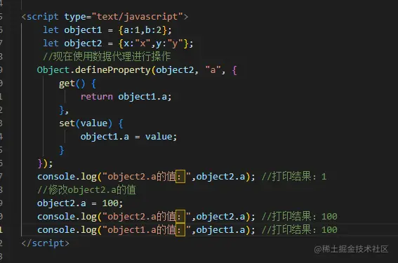 现在我们正式进入vue的数据代理。 首先我们需要清楚数据代理的概念:通过一个对象代理对另一个对象中属性的读写操作。 例如我们定义有object1和object2两个对象,其中object1={a:1,b:2},现在我们使用object2去读取和写入object1中的a、b属性,这个过程就是数据代理。具体的代码如下: