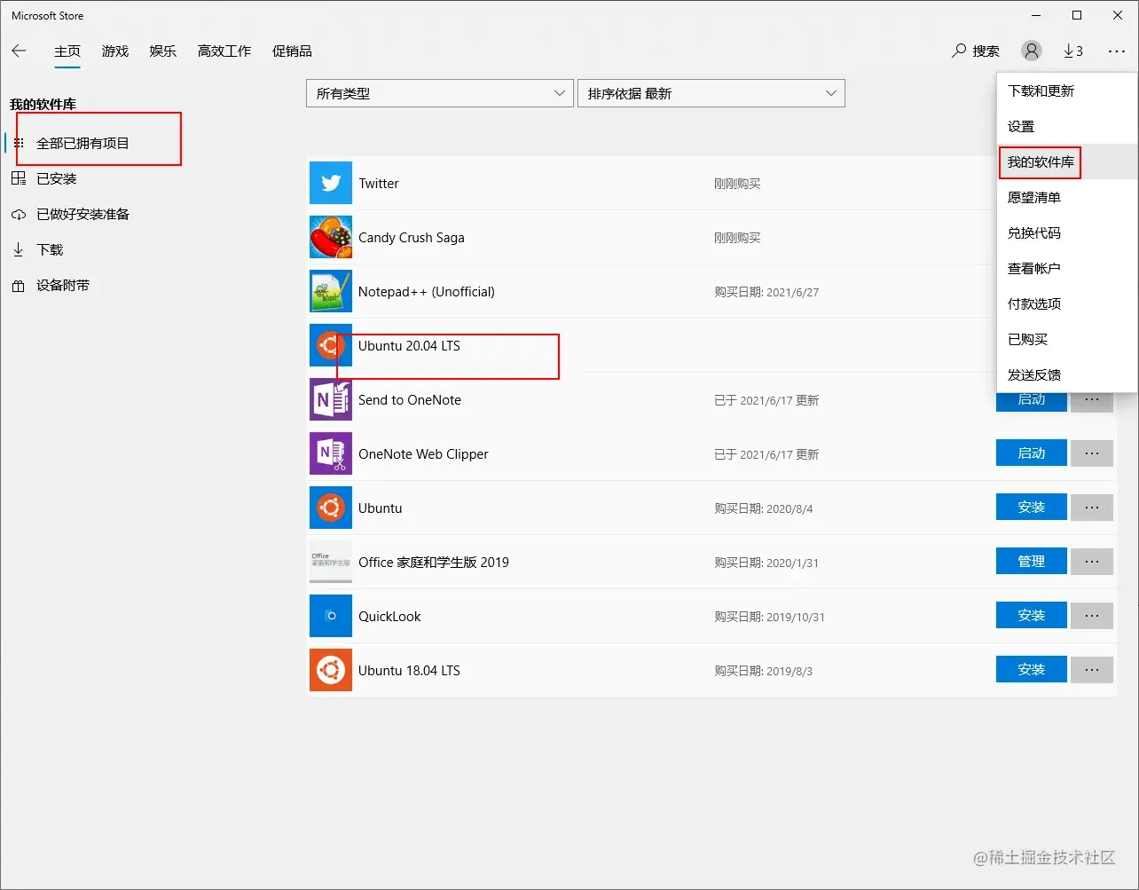 - 一般Windows都会将ubuntu加入到我的软件库中,如果没有可以自行搜索ubuntu然后安装,搜索到商店的有可能安装不了
