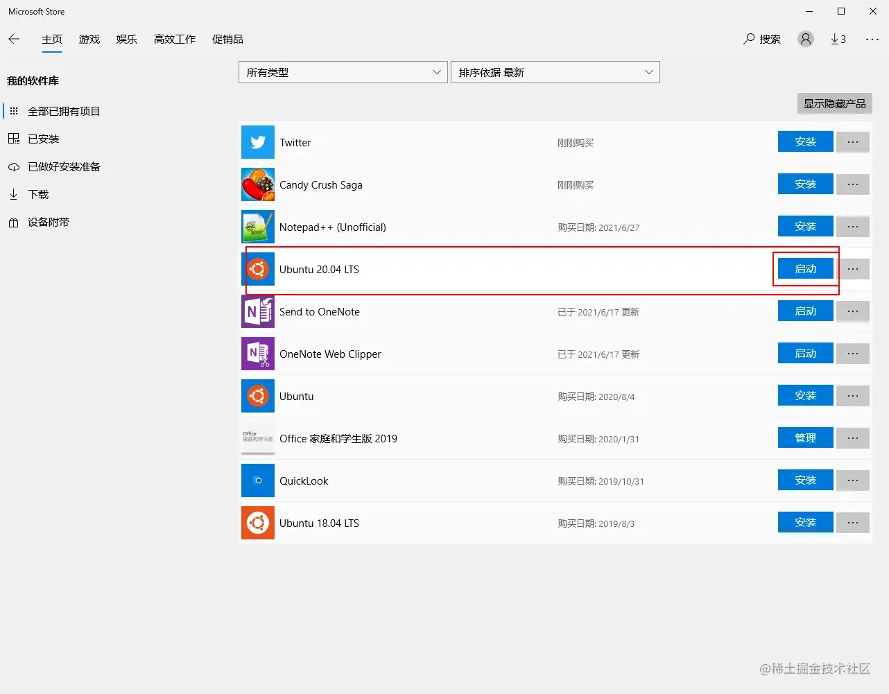 - 找到Ubuntu 20.04LTS点击安装即可,这里我已经安装好了直接点击启动就行\