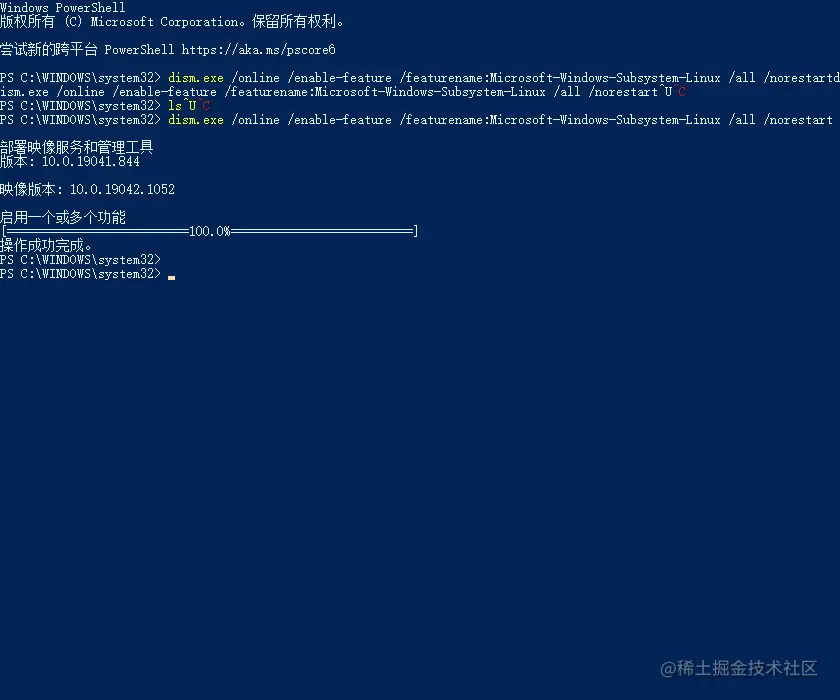- 启用适用于 Linux 的 Windows 子系统:打开powershell并输入: