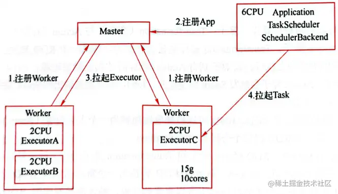 Worker节点启动之后会向 Master 节点注册,此时 Master 就能知晓哪些Worker 节点处于工作状态;当客户端提交 Application 时,会向 Master 注册 App,此时 Master 会根据Application的需要向Spark集群申请所需要的CPU和内存等资源;接着Master节点会在Worker节点上启动Executor进程,比如左侧Worker节点启动两个Executor,分别分配到两个CPU,右侧Worker 节点启动一个 Executor,分配到两个 CPU;最后客户端中的 Driver(驱动)跟 Worker 通信,在各个Worker节点中启动任务作业。