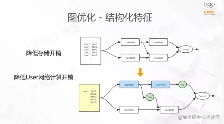 这是从业务启发的一个功能。我们发现在搜索场景下,不管是训练还是推理,样本往往是1个user对应多个item,多个label的特点。原来的处理方式会视为多个样本,这样user的存储是冗余的,我们为了节省这部分开销,自定义了存储格式来做这部分优化。如果这些样本在一个minibatch中是同一个user,部分user网络和item网络会分别计算,最后在做相应的逻辑计算,这样能节省计算开销。所以我们分别从存储和计算端做了结构化的优化。