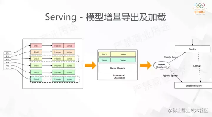 一开始在介绍Embedding的时候其中一个重要的点是低效的IO,如果将前面提到动态弹性功能应用后,我们天然能做增量的导出。只要在图中加入曾经访问的稀疏ID,那么在增量导出的时候就能准确的导出这部分我们需要的ID。我们做这个功能有两个出发点:首先,模型训练时我们原有的方法,在每个step导出全量的模型导出,在程序中断restore时候也是restore checkpoint,最差的时候可能损失两个checkpoint区间所有的结果,有了增量导出,我们对于dense部分会全量导出,sparse部分是增量导出,这在实际场景10分钟的增量导出能很大程度节约restore带来的损失;另外,增量导出的场景是在线serving,如果每次都全量加载,那么对于稀疏场景,模型十分大,每次加载都需要耗费很长时间,如果要做在线学习会很困难,所以增量导出也会用到ODL场景。