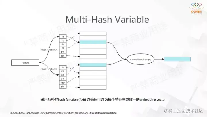 这个功能是为了解决特征冲突的问题。我们原来是通过一个Hash+Mod的方式解决特征冲突,现在用两个或多个Hash+Mod去得到Embedding,并且随后对得到的Embedding做Reduction,这样的好处是能用更少的内存来解决特征冲突的问题。