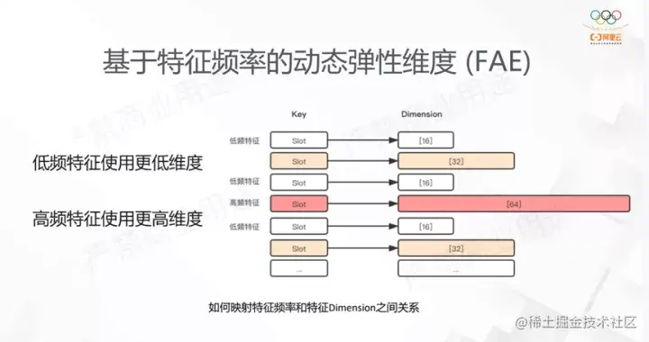 通常情况下同一个特征对应的EmbeddingVariable会被设置为同一个维度,如果EmbeddingVariable被设置一个较高的维度,低频的特征内容容易导致过拟合,并且会消耗大量的内存。相反的如果维度设置的过低,高频的特征内容则有可能因为表达的能力不足而影响模型的效果。FAE的功能则提供了对于同一个特征里,根据不同特征冷热来配置不同的维度。这样让模型自动进行训练时第一个是模型的效果能得到保证,第二个也能解决训练对资源的使用。这是对于FAE功能的出发点的介绍。这个功能的使用目前是让用户传入一个维度和统计的算法,FAE自动根据实现的算法来产生不同的EmbeddingVariable;后面DeepRec计划在系统内部自适应的发现去分配特征的维度,从而提高用户的易用性。