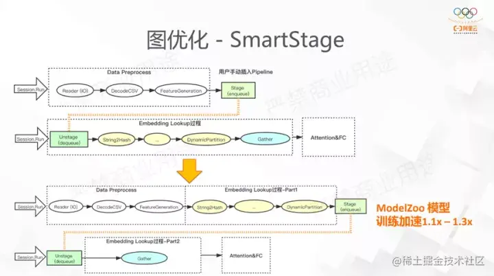 我们看到稀疏模型的训练通常包括样本的读取,EmbeddingLookup,还有MLP的网络计算。样本的读取和Embedding查找往往不是计算密集型的,并不能有效利用计算资源。原生框架提供的prefetch接口虽然能一定程度上完成异步操作,但是我们在EmbeddingLookup过程中设计部分复杂的子图,这些不能通过TensorFlow的prefetch实现流水线。TensorFlow提供的流水线功能,实际使用中需要用户显示的指定stage边界,一方面会提高使用难度,另一方面由于stage的精度不够,无法精确到op级别。对于High Level的API用户无法手动插入,会导致很多步伐并行化。下图是SmartStage的具体操作,它会将Op自动的归类到不同的Stage,使得并发的流水线能得到性能的提升。我们在ModelZoo里模型的测试效果最大加速比能达到1.1-1.3。
