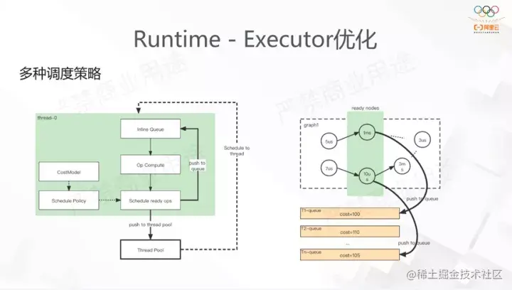 TensorFlow原生的Executor的实现十分简单,首先对DAG做拓扑排序,随后将Node插入到执行队列中,通过Task利用Executor调度。这样的实现没有结合业务考虑,ThreadPool默认使用了Eigen线程池,若线程负载不均匀,会发生大量的线程间抢占Steal,带来极大开销。我们在DeepRec中定义调度更均匀,同时定义了关键路径使得在调度的时候有一定的优先级顺序,来执行Op。最终DeepRec也提供了多种包括基于Task,SimpleGraph的调度策略。