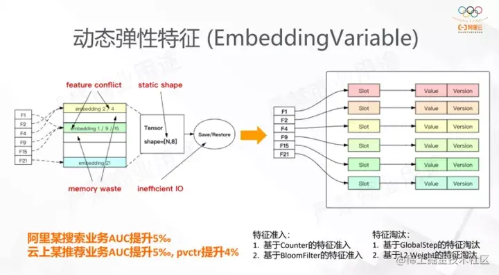 在这种情况下,DeepRec定义的EmbeddingVariable设计的原理是:将静态的Variable转化为动态的类似HashTable的存储,每来一个key,新创建一个Embedding,这样就天然地解决了特征冲突的问题。经过这样的设计,当特征特别的多的时候,EmbeddingVariable无序的扩张,内存消耗也会变得很大,因此DeepRec引入了以下两个功能:特征准入和特征淘汰。它们都能有效的防止特征扩展到很大的维度。在搜索和推荐这样的稀疏场景,有些长尾特征被模型训练的次数十分少。因此特征准入能通过CounterFilter或者BloomFilter的方式对特征进入EmbeddingVariable设置一个门槛;在模型导出Checkpoint的时候也会有特征淘汰的功能,时间上比较老的特征也会被淘汰。这在阿里内部某个推荐业务AUC提升5‰,在云上某推荐业务AUC提升5‰,pvctr也有提升4%。