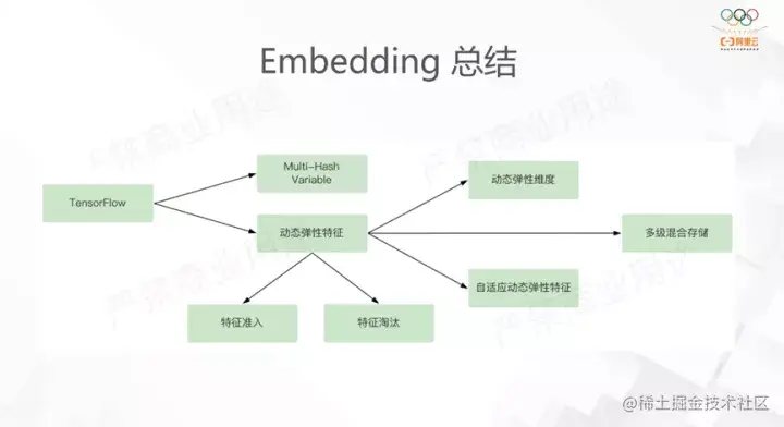 以上是对Embedding所有功能的介绍。我们做这些功能的动机是由于TensorFlow的几个问题(主要是特征冲突),我们解决的方案是动态弹性特征和Multi-Hash特征,针对动态弹性特征内存开销较大的问题,我们又开发了特征准入和特征淘汰的功能;针对特征频次,我们开发了3组功能:动态弹性维度和自适应动态弹性特征是从维度的方向解决的问题,多级混合存储则是从软硬件的方向解决的问题。