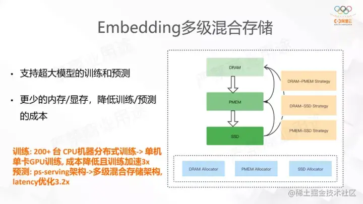 这一功能的出发点同样也是发现EV在特征个数多的时候,内存开销十分大,训练的时候worker占用的内存可能达到了几十上百G。我们发现,特征实际上遵循典型的幂律分布。考虑到这个特征点,我们将热点特征放到CPU这样更宝贵的资源,而相对长尾低频的特征则放到相对廉价的资源中。如右图,有DRAM、PMEM、SSD三种结构,PMEM是英特尔提供的速度介于DRAM和SSD之间,但容量很大。我们目前支持DRAM-PMEM、DRAM-SSD、PMEM-SSD的混合,也在业务上取得了效果。云上有个业务 原来用200+多CPU分布式训练,现在使用多级存储后改成了单机GPU训练。