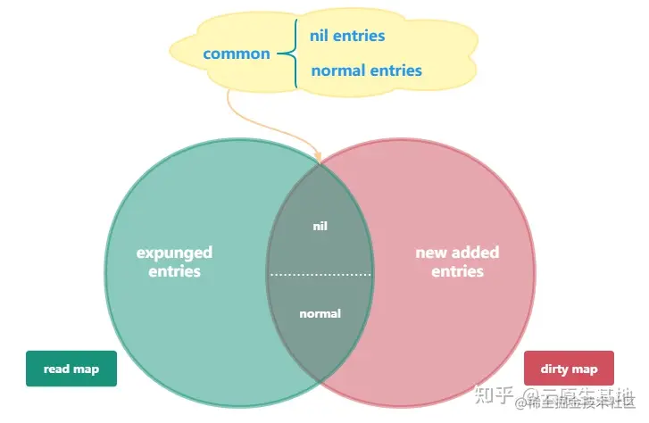 - expunged和nil,都表示标记删除,但是它们是有区别的,简单说expunged是read独有的,而nil则是read和dirty共有的,具体这么设计的原因,最后统一总结。