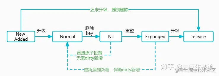 - e.p==普通指针:此时entry是一个普通的存在状态,属于read,如果dirty非nil,也属于dirty。对应架构图中的normal状态。