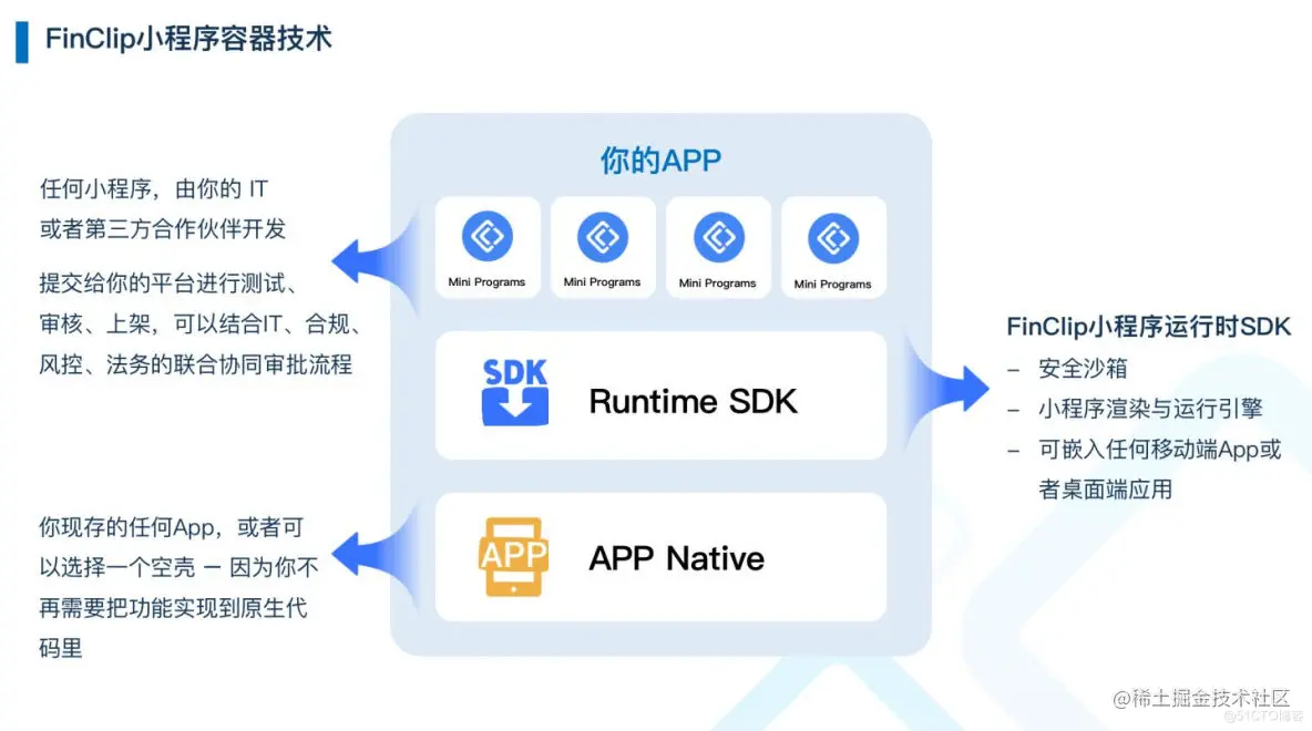 FinClip完全遵循微信小程序的开发标准与规范。也就是说,现有的微信小程序可以不改一行代码,直接放进你的 App 里面,运行效果保持不变,不必额外二次开发和改造,大大节省了人力成本。