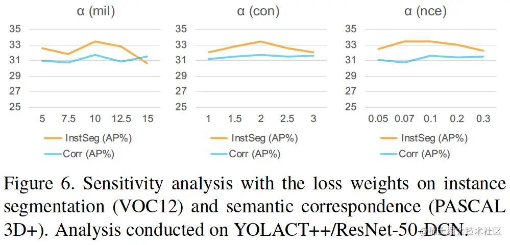 我们使用 Lmil, Lcon and Lnce 对 VOC12 进行消融研究。选项卡中的结果。表3 显示了 Lcon and Lnce的持续改进,展示了结构化教师的好处。我们还对实例分割(VOC12)1 和语义对应(PASCAL 3D+,参见第 4.4 节)的损失权重进行敏感性分析。图 6 中的结果表明 DISCOBOX 对重量变化不敏感。