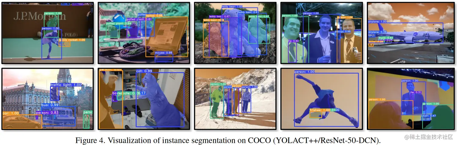 我们在弱监督实例分割上实现了最先进的性能。我们最好的模型在 COCO test-dev 上实现了 37.9% 的 AP,超过了 YOLACT++ [50] (34.6% AP) 和 Mask R-CNN [51] (37.1% AP) 等竞争监督方法。