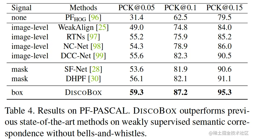 我们首先使用 YOLACT++/ResNet-50-DCN 在 PF-PASCAL [88] 上评估 DIS-COBOX,主要结果见表。 表4. 我们不直接在 PF-PASCAL 上训练 DISCOBOX 模型。相反,我们在 VOC12 训练集上训练它,不包括那些存在于 PF-PASCAL 验证集中的图像。值得注意的是,许多现有的语义对应方法不能在没有重大变化的情况下在 VOC12 上进行类似的训练,尽管其中一些确实考虑了一定程度的定位信息,例如注意力。