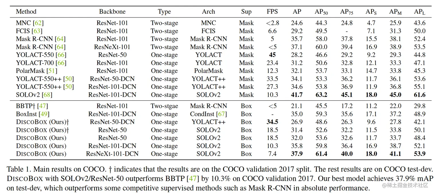 表 1. COCO 的主要结果。 y 表示结果基于 COCO 验证 2017 拆分。其余结果在 COCO test-dev。DISCOBOX 上,SOLOv2/ResNet-50 在 2017 年 COCO 验证中优于 BBTP [47] 10.3%。我们最好的模型在 test-dev 上实现了 37.9% 的 mAP,优于一些竞争性监督方法,例如Mask R-CNN 的绝对性能。