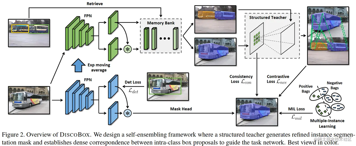 图 2. DISCOBOX 概览。我们设计了一个自集成框架,其中结构化教师生成精细的实例分割掩码,并在类内框建议之间建立密集对应以指导任务网络。最好以彩色观看。